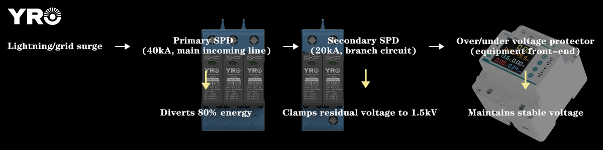 A partir de esto, se puede ver que los dispositivos de protección de relámpagos y los dispositivos de protección contra la sobretensión y la sobretensión son complementarios: SPD no puede hacer frente a la sobrevoltaje continuo en la red eléctrica, y en este momento, se necesita un dispositivo de protección de voltaje para cortar la fuente de alimentación. El protector de voltaje no tiene respuesta a los rayos a nivel de nanosegundos y requiere que SPD proporcione protección transitoria.